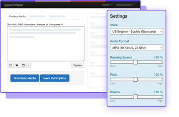 speechMaker Desktop برنامج مثاليّ لإضافة أداة TTS ReadSpeaker إلى مقاطع الفيديو لأنّه يمكن استخدامه دون الحاجة إلى الاتّصال بالإنترنت. بعد الاستماع إليه وتجربته، وبمجرّد أن يبدو النّص صحيحًا، نزّلْ الملفّات الصّوتيّة وفق التّنسيق الذي تختاره، ثم حمّلها إلى محرّر الفيديو الخاصّ بك. أصبح محتوى الفيديو الصّوتيّ الخاصّ بك جاهزًا للاستخدام!