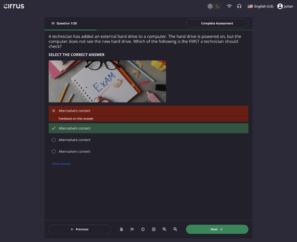 A high-contrast mode reduces eye strain during long sessions. Audio support helps candidates who are stressed or tired process complex wording. Keyboard navigation cuts through clutter for anyone who just wants to focus. These aren’t “special features”, they’re signs of a well-designed system.